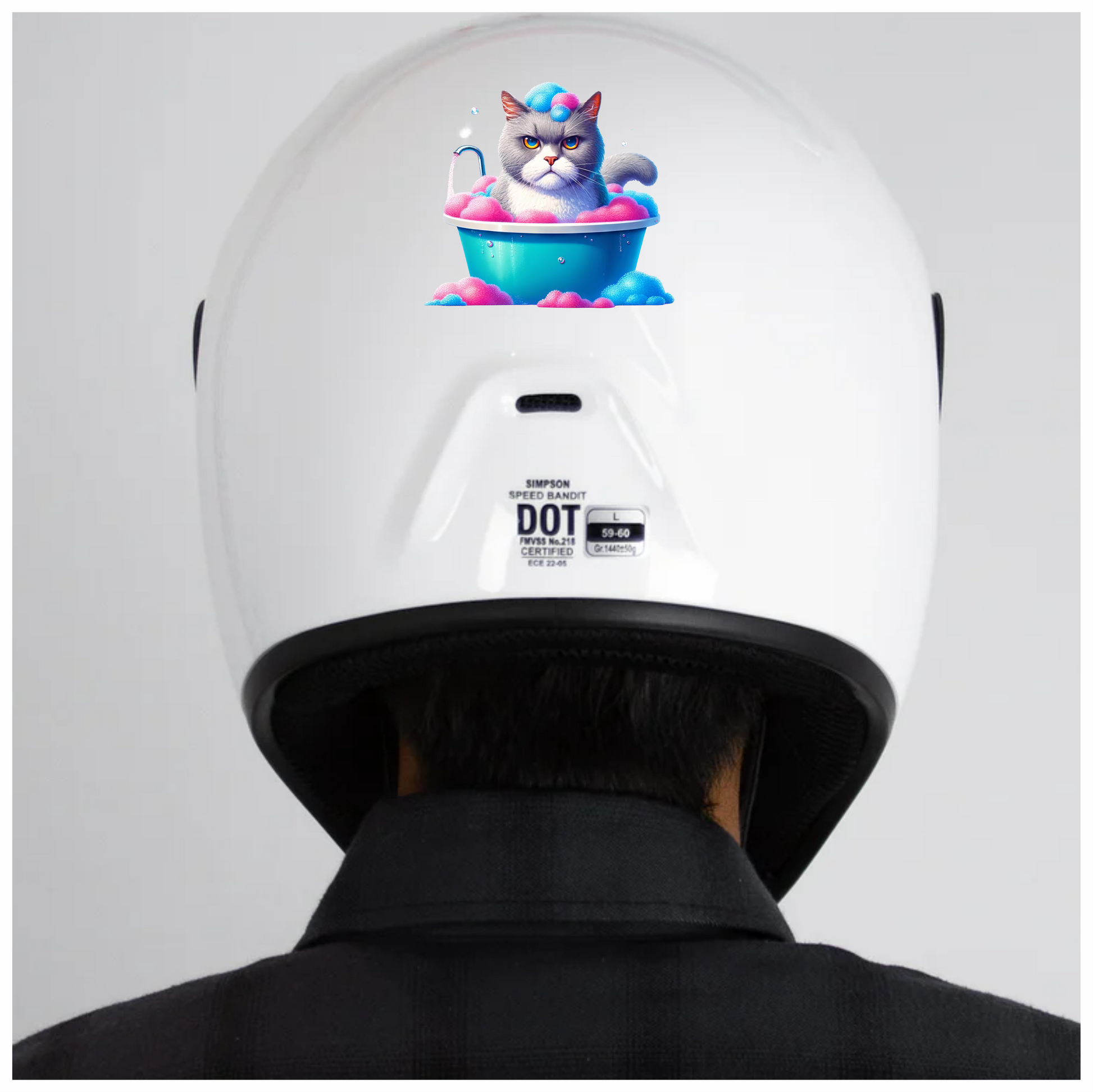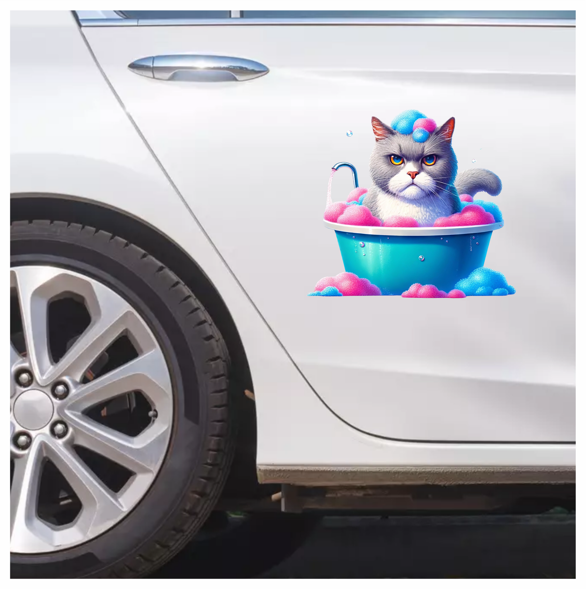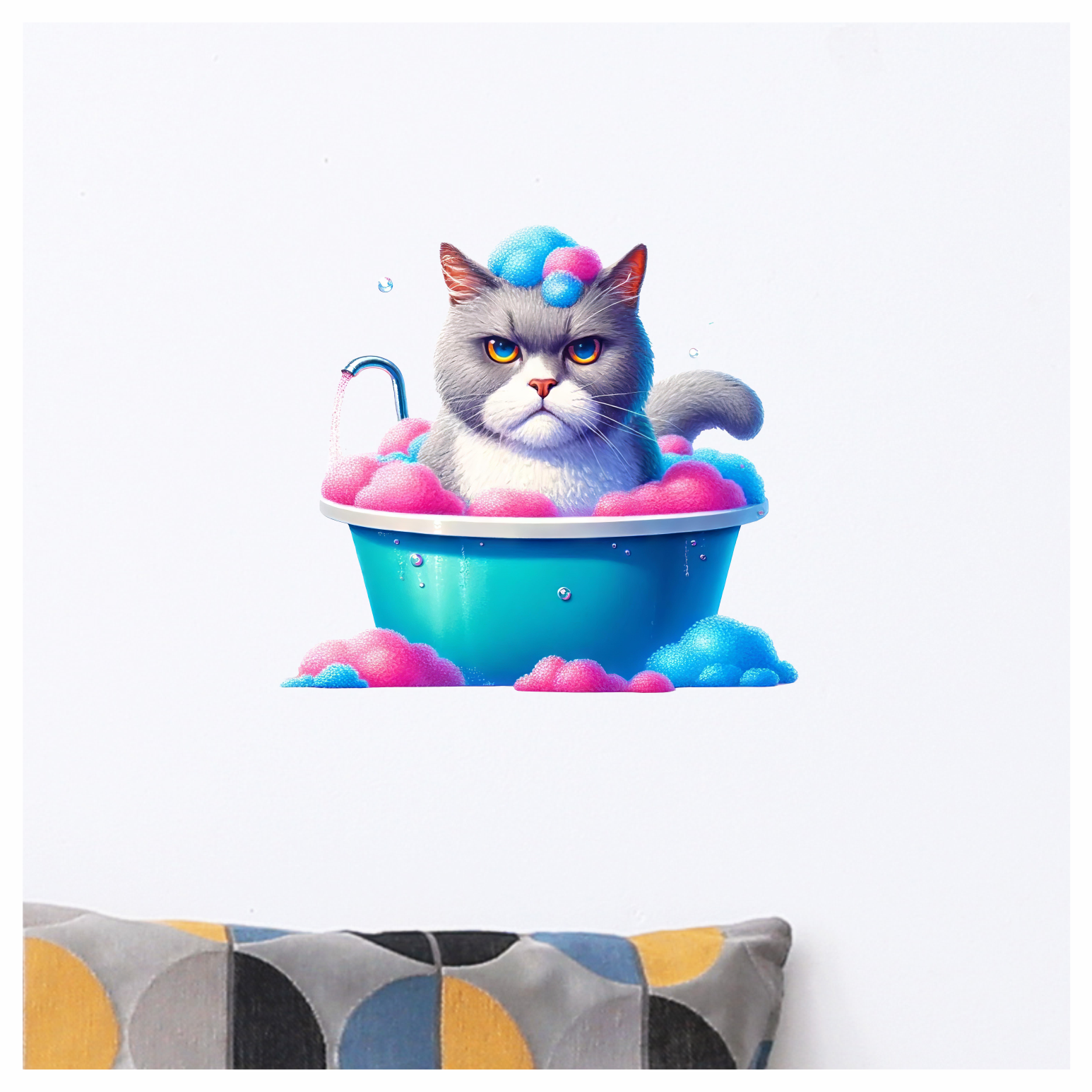 Gray Cat In Blue Bathtub Vinyl Sticker Decal