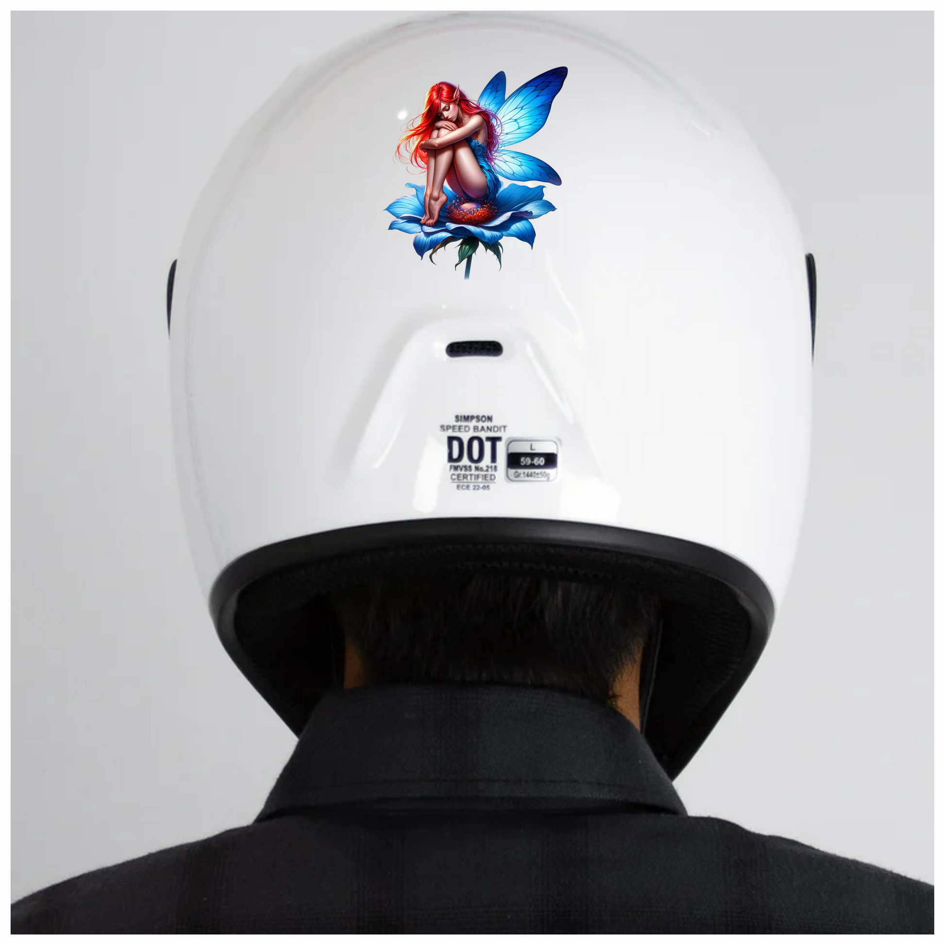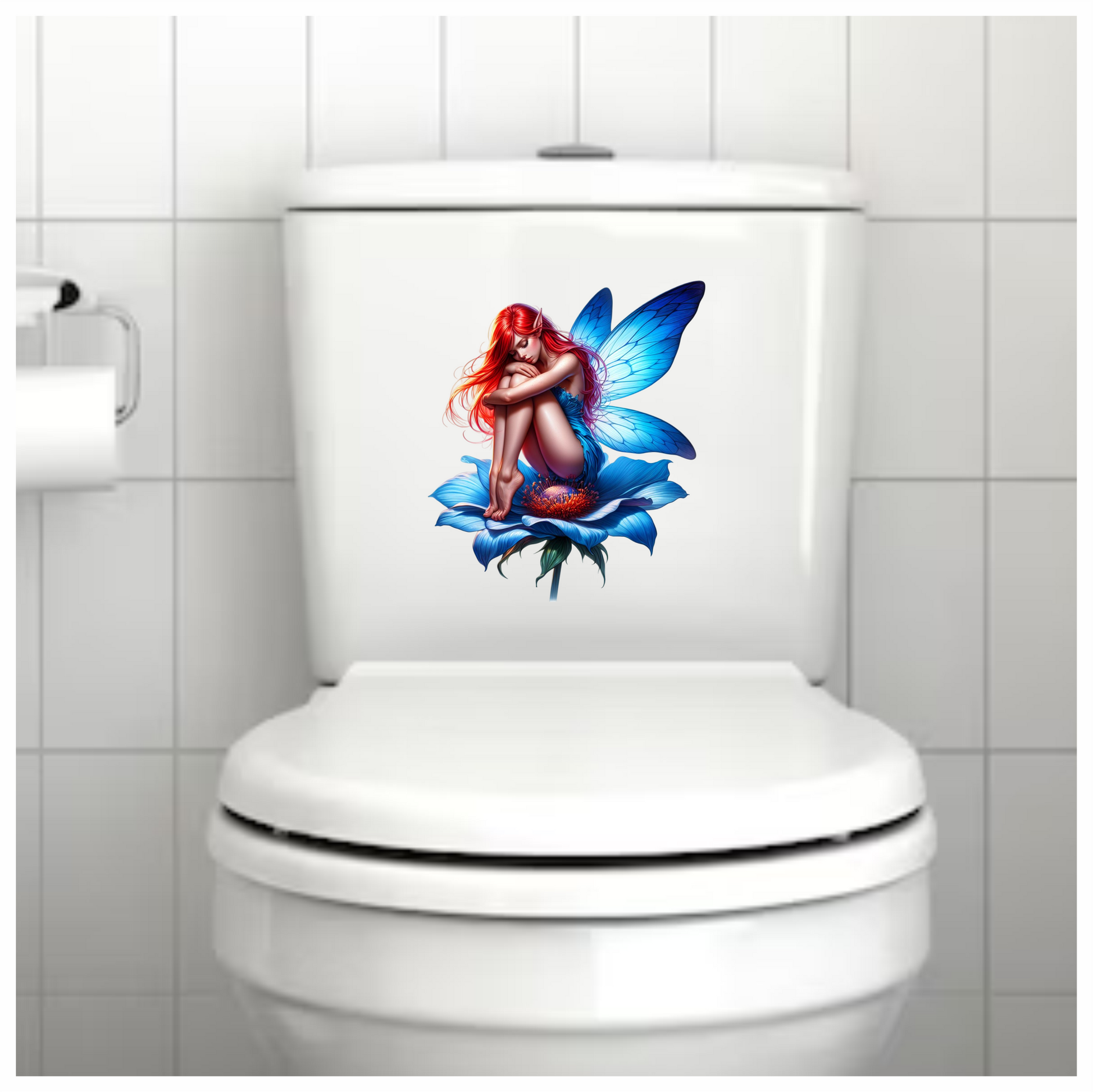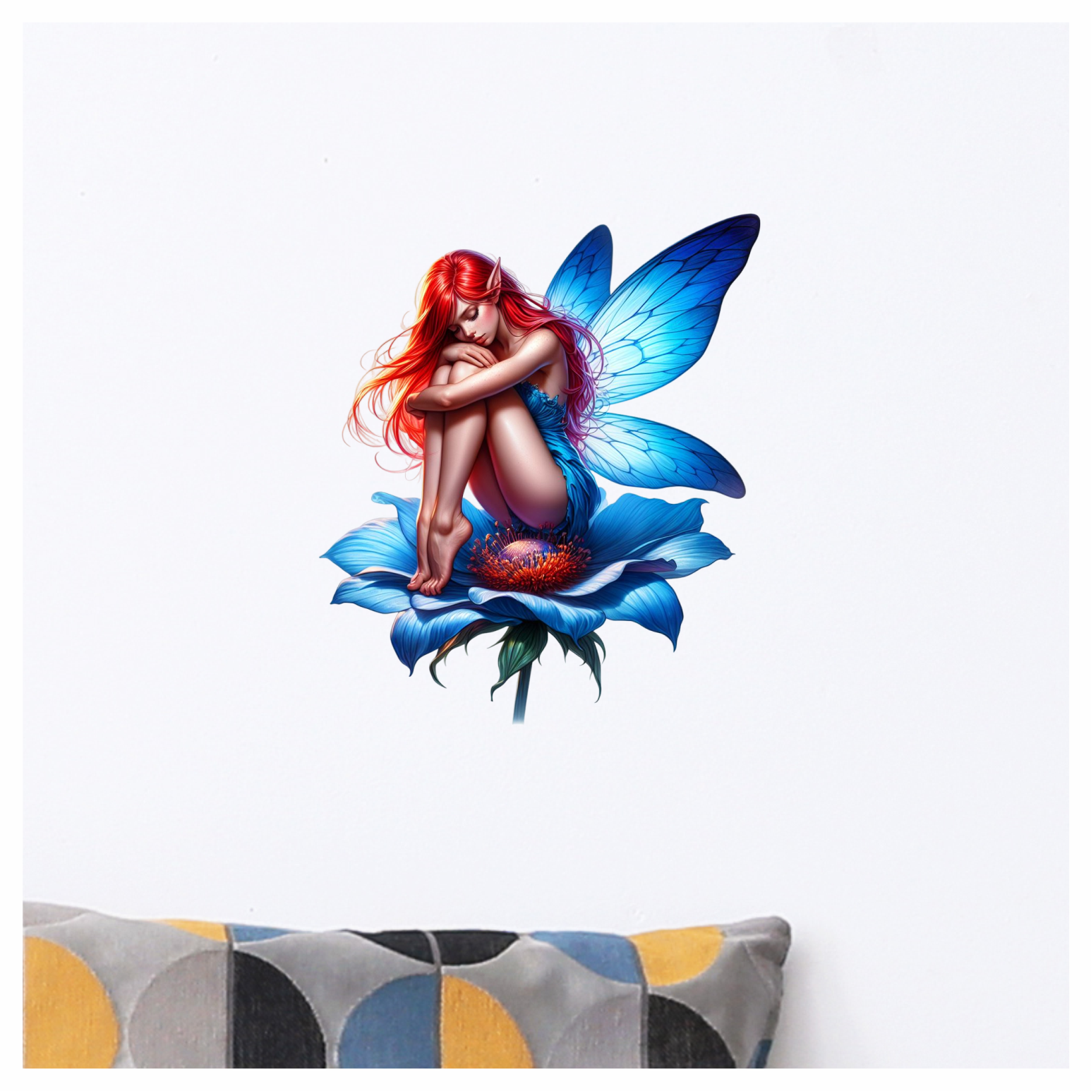 Red Fairy Sitting Blue Flower Vinyl Sticker Decal